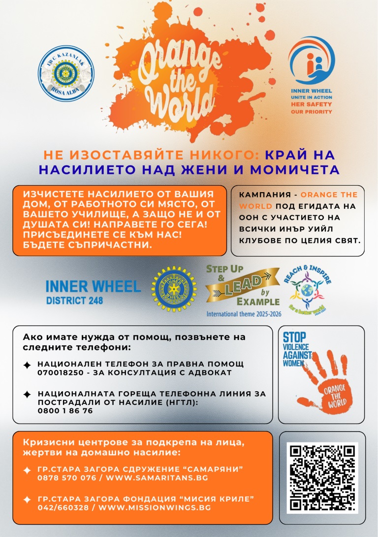 Инър Уийл клуб „Казанлък Роза Алба“ става част от международната кампания на ООН – Оранжевата инициатива, която се провежда ежегодно и обединява милиони хора по света в призив за прекратяване на насилието над жени и момичета. През 2025 година, с подкрепата на OOН, нашата кампания има свое лого и слоган- Inner Wheel UNiTE in Action Her Safety Our Priority / Интернешънъл Инър Уийл и ООН обединени в действие - нейната безопастнос е наш приоритет/
