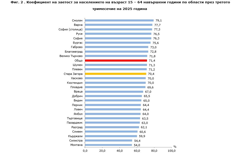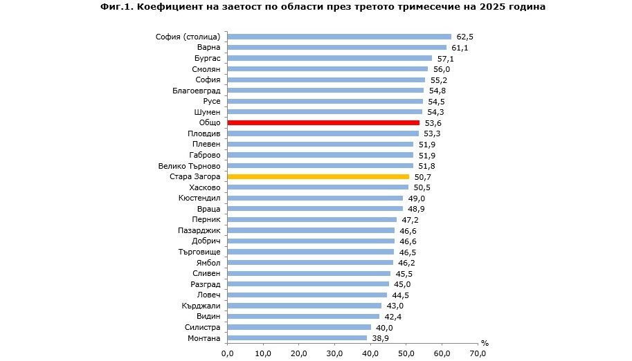 Коефициентът на заетост в областта е 50.7% (при 53.6% за страната), съобщават от Националния статистически институт (НСИ).