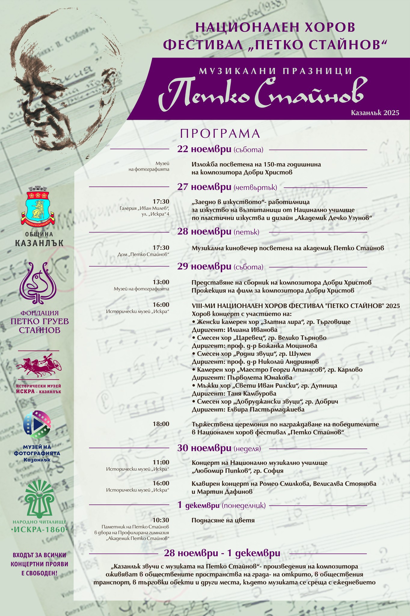В програмата са включени мобилна изложба, представяне на сборник и интернет страница с произведения на композитора. Участие в проявата ще вземе със свои изпълнения Смесен хор „Петко Стайнов“ при НЧ „Искра-1860“ – Казанлък с диригент Младен Станев, а специален гост ще бъде Любомир Кутин от екипа на Държавна опера – Стара Загора.