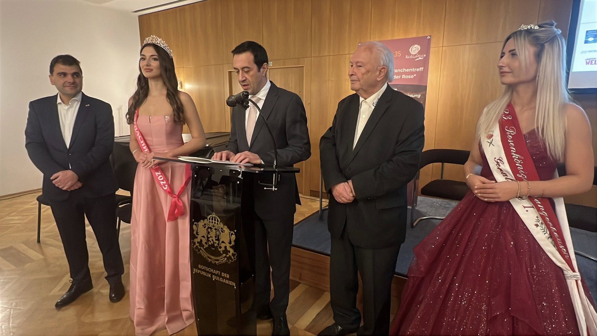 Константина Костадинова 1-ва подгласничка на Царица Роза, подари картина на Жералдин Херзберг- царицата на розата в Зангерхаузен. Възможностите за посещения в България представи и Тихомир Патарински, аташе по туризъм на България в столицата на Германия – Берлин.