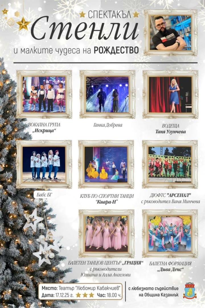 Коледен благотворителен концерт-спектакъл „Стенли и малките чудеса на Рождество“ ще се проведе на 17-ти декември в залата на Театър „Любомир Кабакчиев“ от 18ч., с участието на едни от най-ярките местни таланти – певци, танцьори, ансамбли и художествени формации.