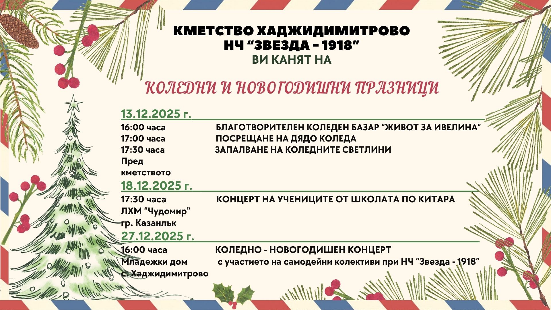 Тържествен Коледно-новогодишен концерт с участието на самодейни колективи при НЧ "Звезда-1918" ще радва жители и гости на 27-ми декември в Младежкия дом на Хаджидимитрово.