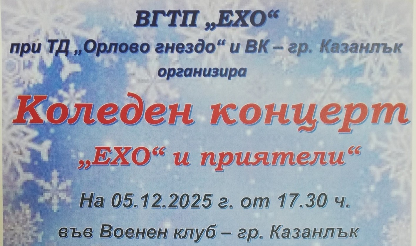 Вокална група за туристически песни (ВГТП) „ЕхО“ при ТД „Орлово гнездо“ и ВК – гр. Казанлък организира коледен концерт "ЕхО и приятели“. Събитието ще се състои в петък, 5-ти декември от 17:30 часа във Военен клуб – гр. Казанлък.