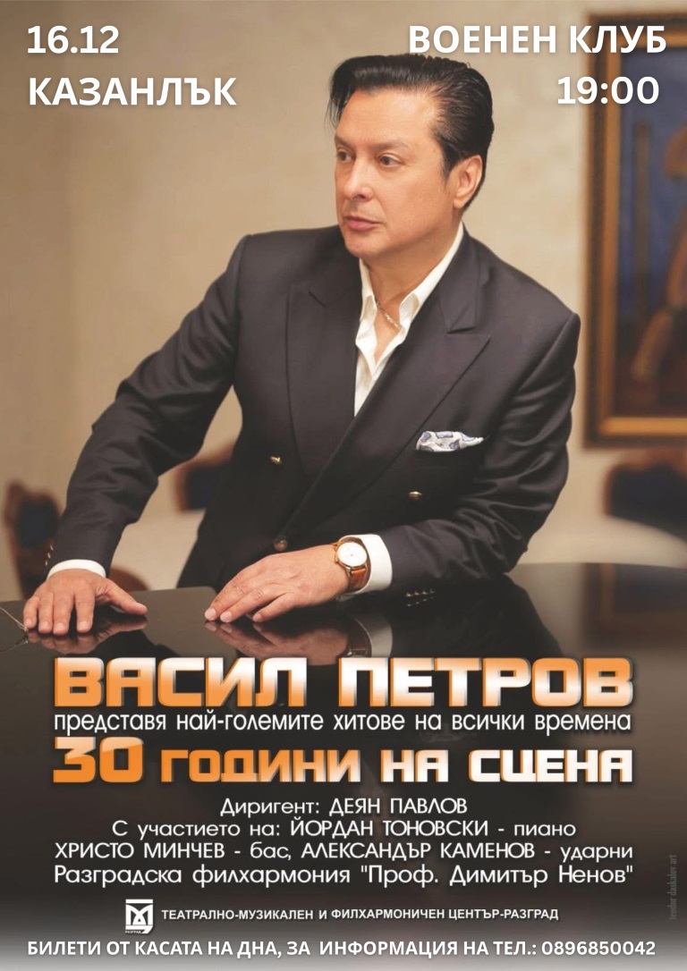 Неподражаемият глас на България, Васил Петров, гостува в град Казанлък на 16 декември, за да представи новия си проект заедно с Разградска филхармония "Проф. Димитър Ненов" с маестро Деян Павлов. Концертът е от 19:00ч. и ще се състои на сцената в Военния клуб на гр.Казанлък.