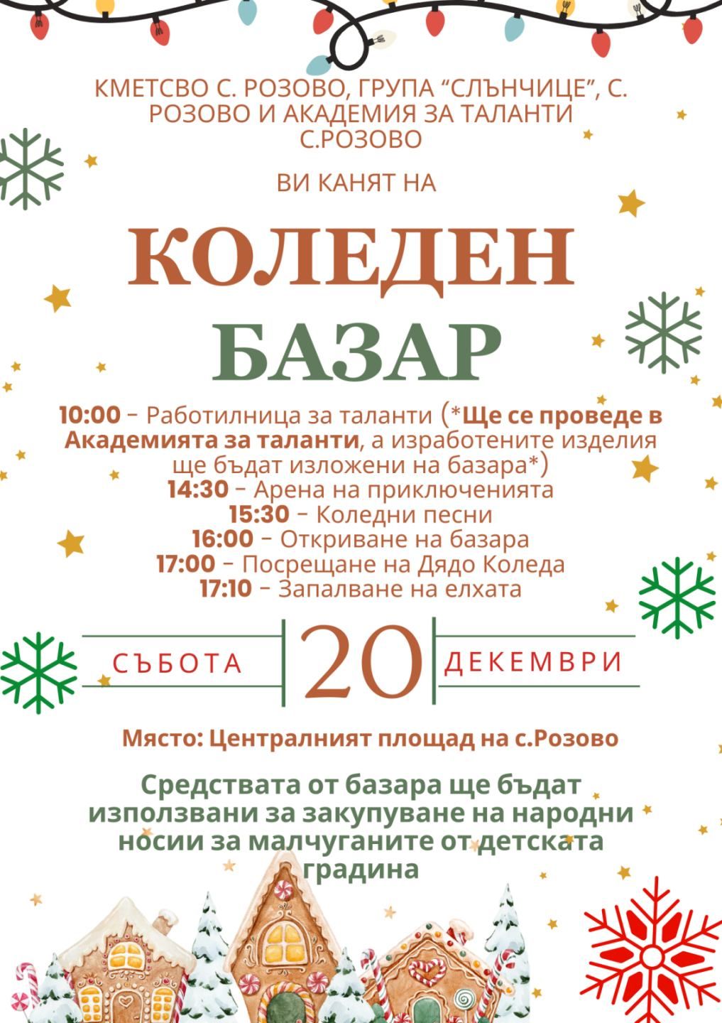 Кметство село Розово, група „Слънчице“ и Академията за таланти организират на 20 декември (събота) благотворителен коледен базар, който ще се състои на централния площад в селото.
