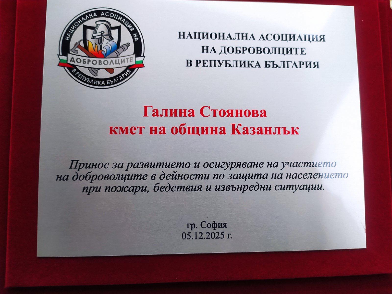 Кметът на Община Казанлък Галина Стоянова беше отличена в националния конкурс „Работодател на годината“ за 2025 г., организиран от Главна дирекция „Пожарна безопасност и защита на населението“ (ГДПБЗН) и Националната асоциация на доброволците в Република България по случай Международния ден на доброволеца - 5 декември.