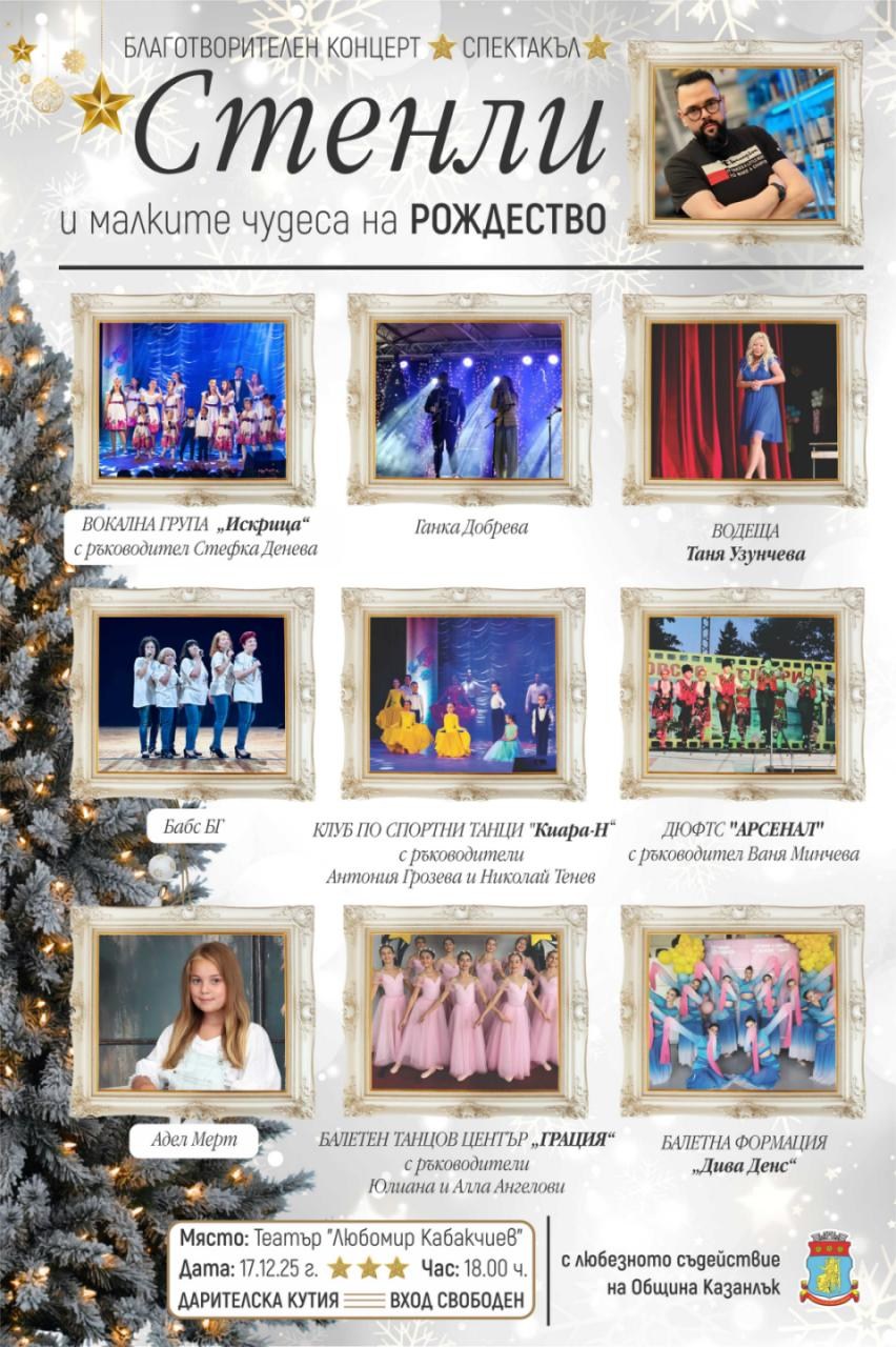Коледен благотворителен концерт-спектакъл „Стенли и малките чудеса на Рождество“ ще се проведе на 17-ти декември в залата на Театър „Любомир Кабакчиев“ от 18ч., с участието на едни от най-ярките местни таланти – певци, танцьори, ансамбли и художествени формации.