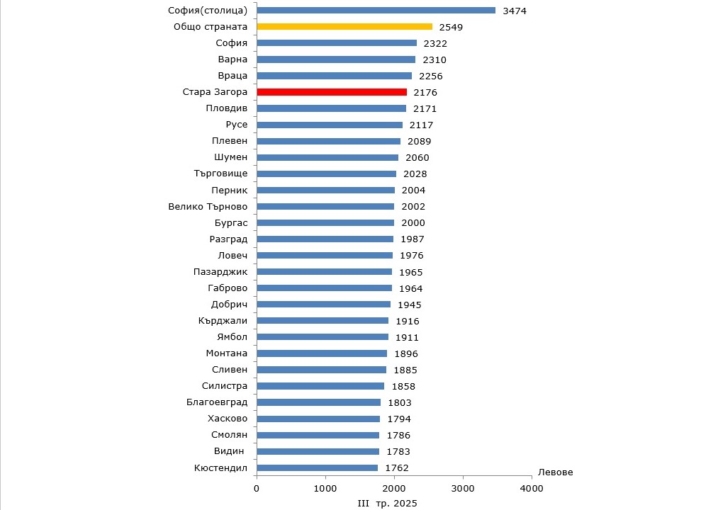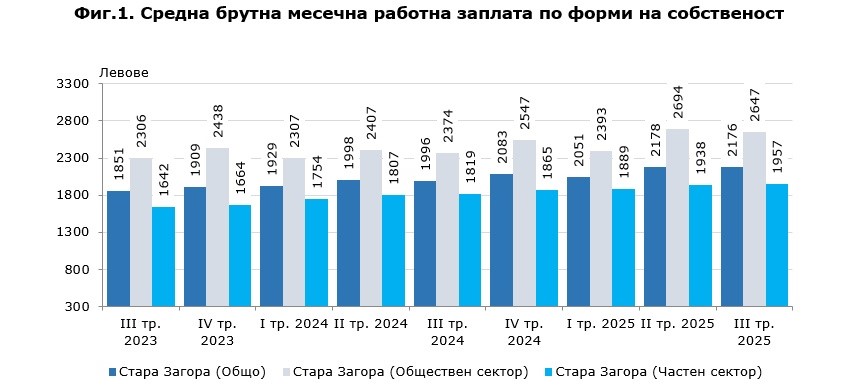 Средната брутна месечна работна заплата в област Стара Загора за юли 2025 г. е 2 166 лв., за август – 2 147 лв. и за септември – 2 215 лева.