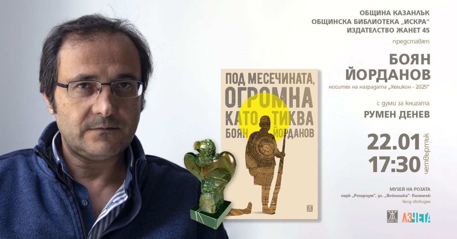 Боян Йорданов ще представи в Музея на розата в Казанлък на 22 януари от 17:30 часа, новия си роман „Под месечината, огромна като тиква“. Събитието е част от поредицата "Роза на ветровете - съвременна българска проза" и е организирано от Община Казанлък и Общинска библиотека 'Искра".