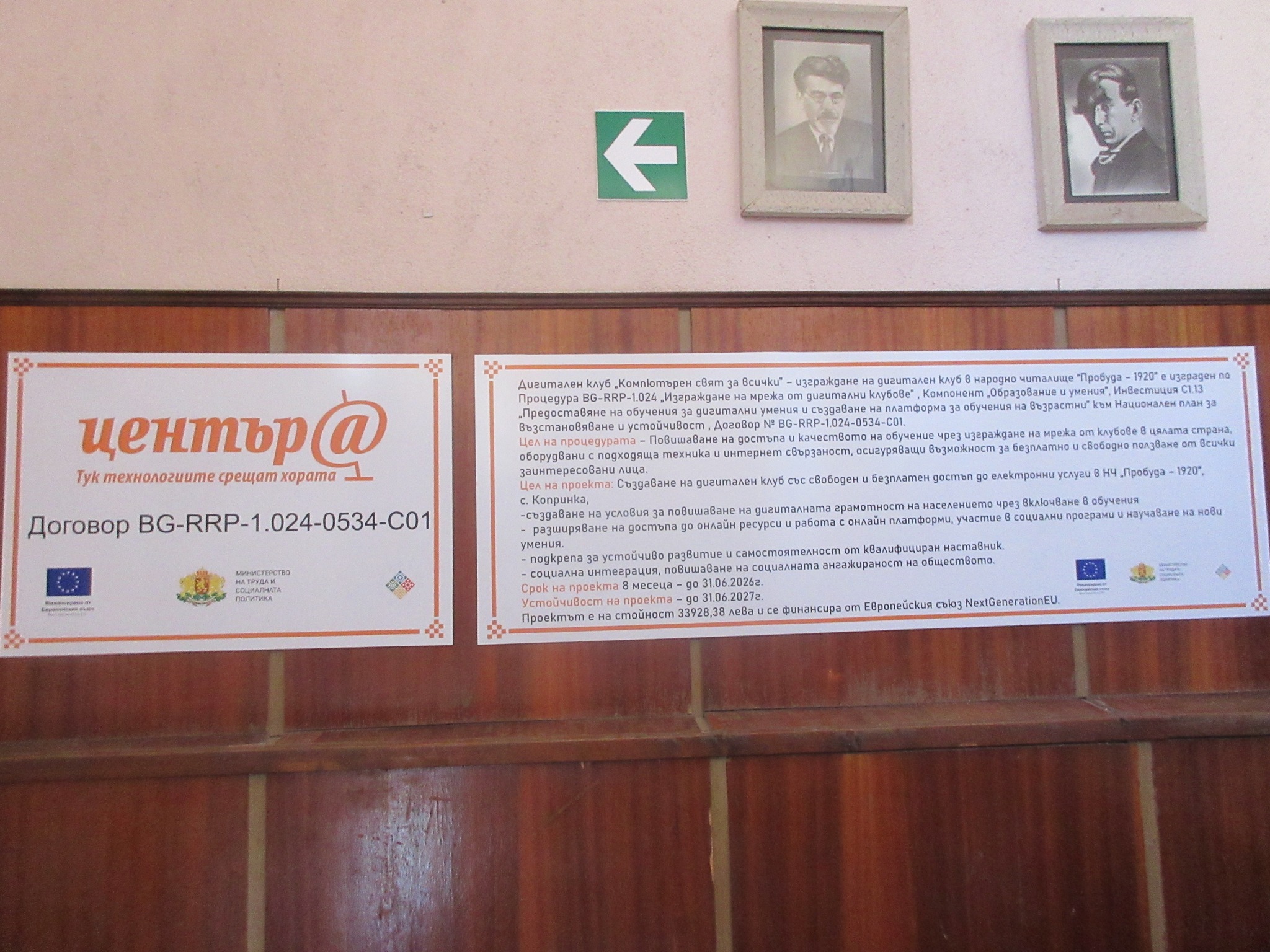 На 28.01.2026 г. отвори врати Дигитален клуб „Компютърен свят за всички” към НЧ „Пробуда – 1920”, с. Копринка за свободен и безплатен достъп до електронни ресурси за всички, желаещи да повишат своята дигитална грамотност.