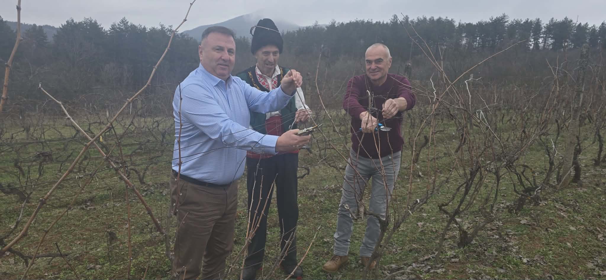 Градоначалникът и собственикът на лозето направиха ритуалното зарязване.