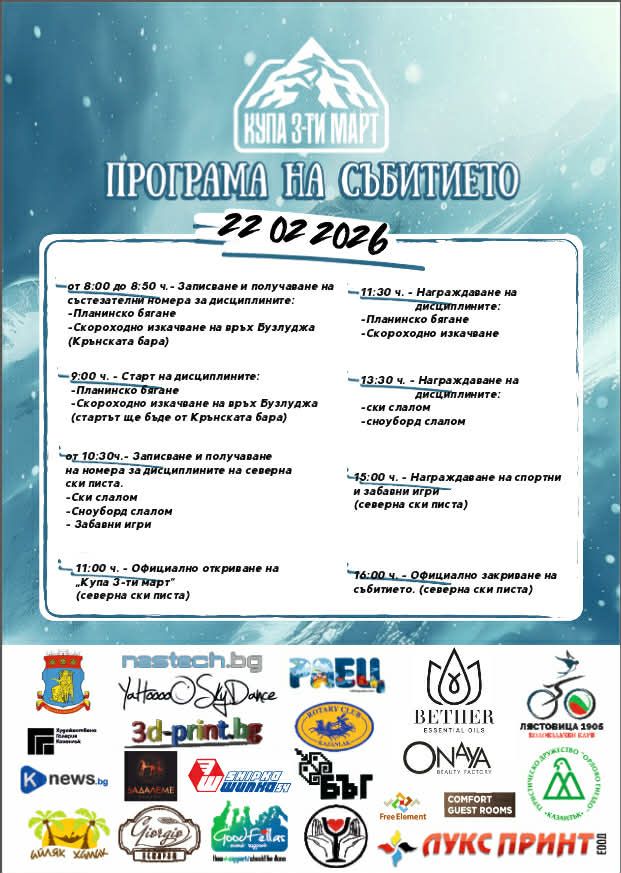 За трета поредна година „Купа 3-ти март“ ще събере малки и големи на пистите в района на Бузлуджа. Спортният празник ще се състои на 22 февруари от 11:00 часа и ще обедини любители на зимните спортове и активния начин на живот.