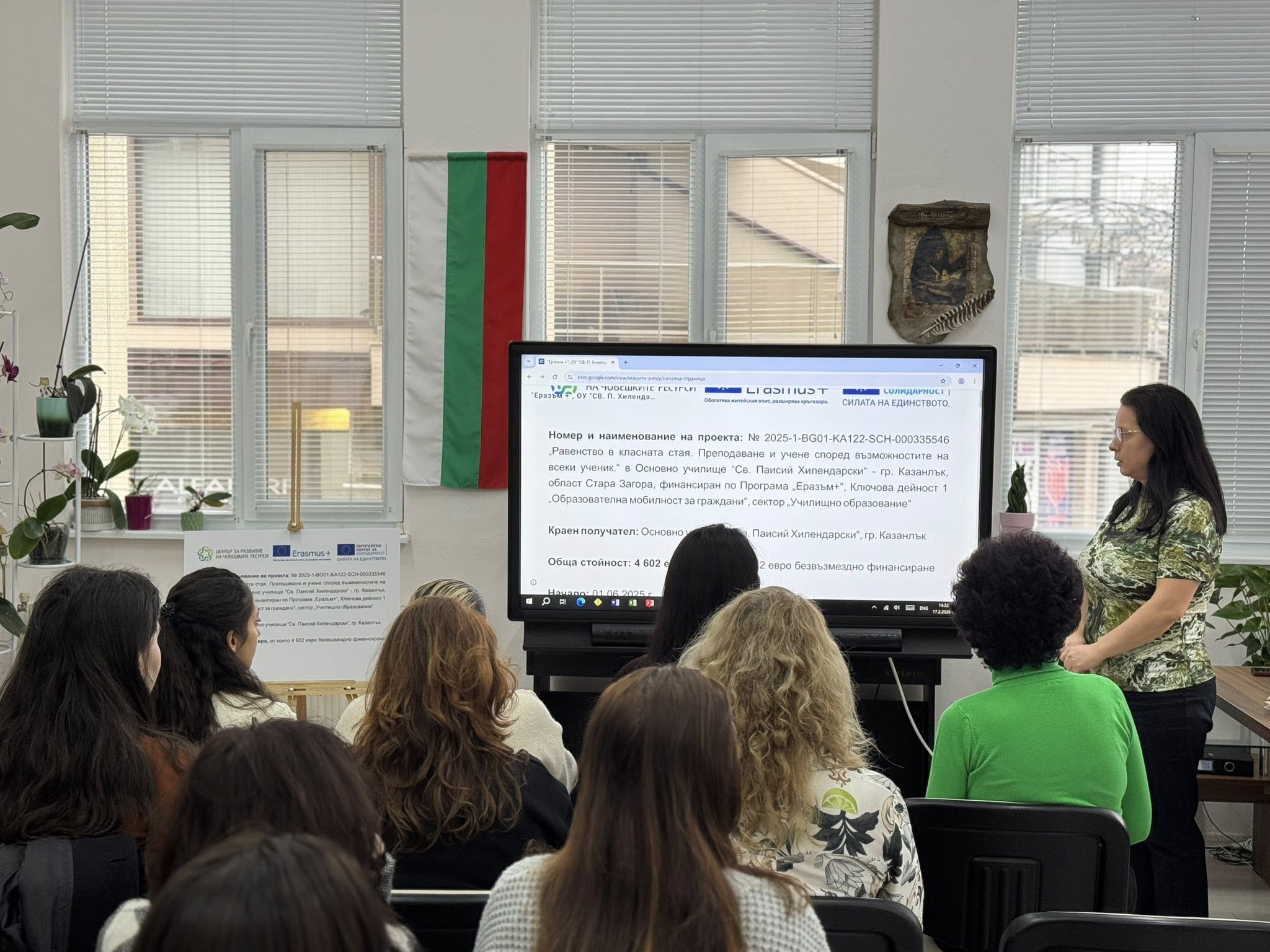 На 17 февруари 2026 г. в ОУ „Св. Паисий Хилендарски“, гр. Казанлък се проведе заключителна среща по Проект по програма „Еразъм +“, Ключова дейност 1 „Образователна мобилност за граждани“, сектор „Училищно образование“, на тема „Равенство в класната стая. Преподаване и учене според възможностите на всеки ученик“ с представители на образователни институции в общината. Присъстващите бяха запознати с резултатите от дейностите по проекта.