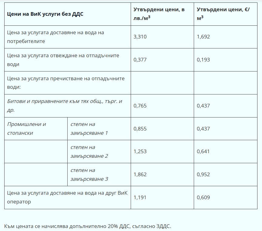 С решение № Ц- 36 от 19.12.2025 г. на Комисия за енергийно и водно регулиране /КЕВР/ бяха обявени актуализираните цени на ВиК услугите в страната, одобрени за прилагане от 1 януари 2026 г. Актуализацията е във връзка с одобрените от КЕВР бизнес планове за развитието и дейността на водното дружество. Промяната на цените на ВиК услугите е необходима с оглед покриване оперативните разходи на дружеството, включително за заплати, осигуровки, ел. енергия, както и изпълнението на инвестиционната програма с цел подобряване качеството и сигурността на водоснабдителните и канализационни услуги.