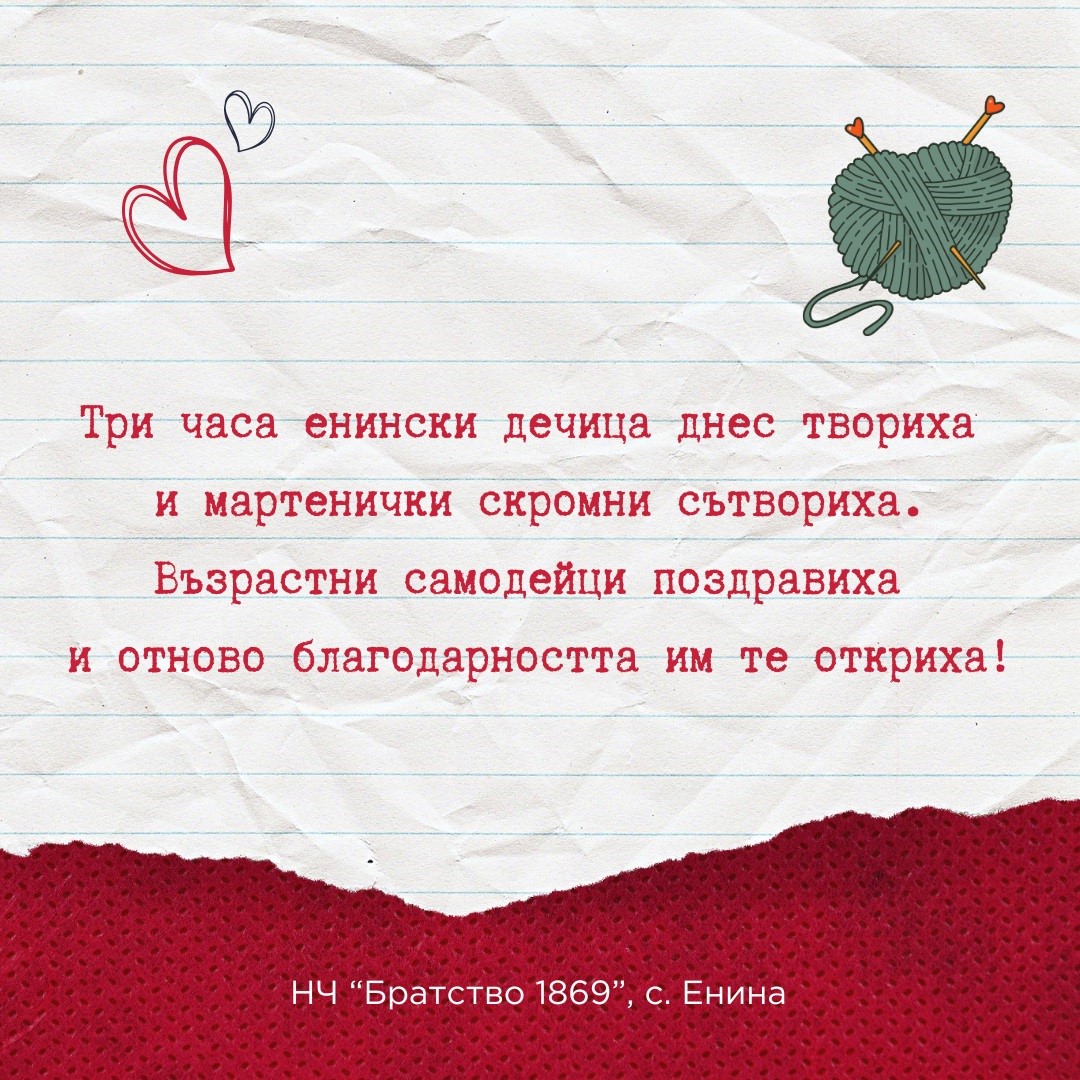 В НЧ “Братство 1869”, с. Енина бе организирана мартенска творилница, по време на която се запознахме с легендите, които се носят около този празник и изплетохме пъстри, семпли и красиви мартенички.