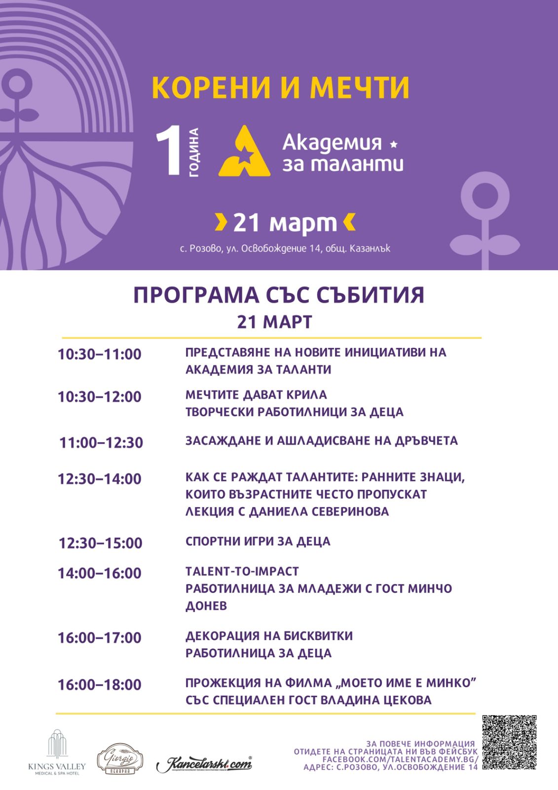 На 21 март Академия за таланти в с. Розово ще отбележи първата година от създаването си с еднодневно събитие под надслов „Корени и мечти“. Инициативата е насочена към деца, родители и младежи и съчетава образователни, творчески и практически дейности.