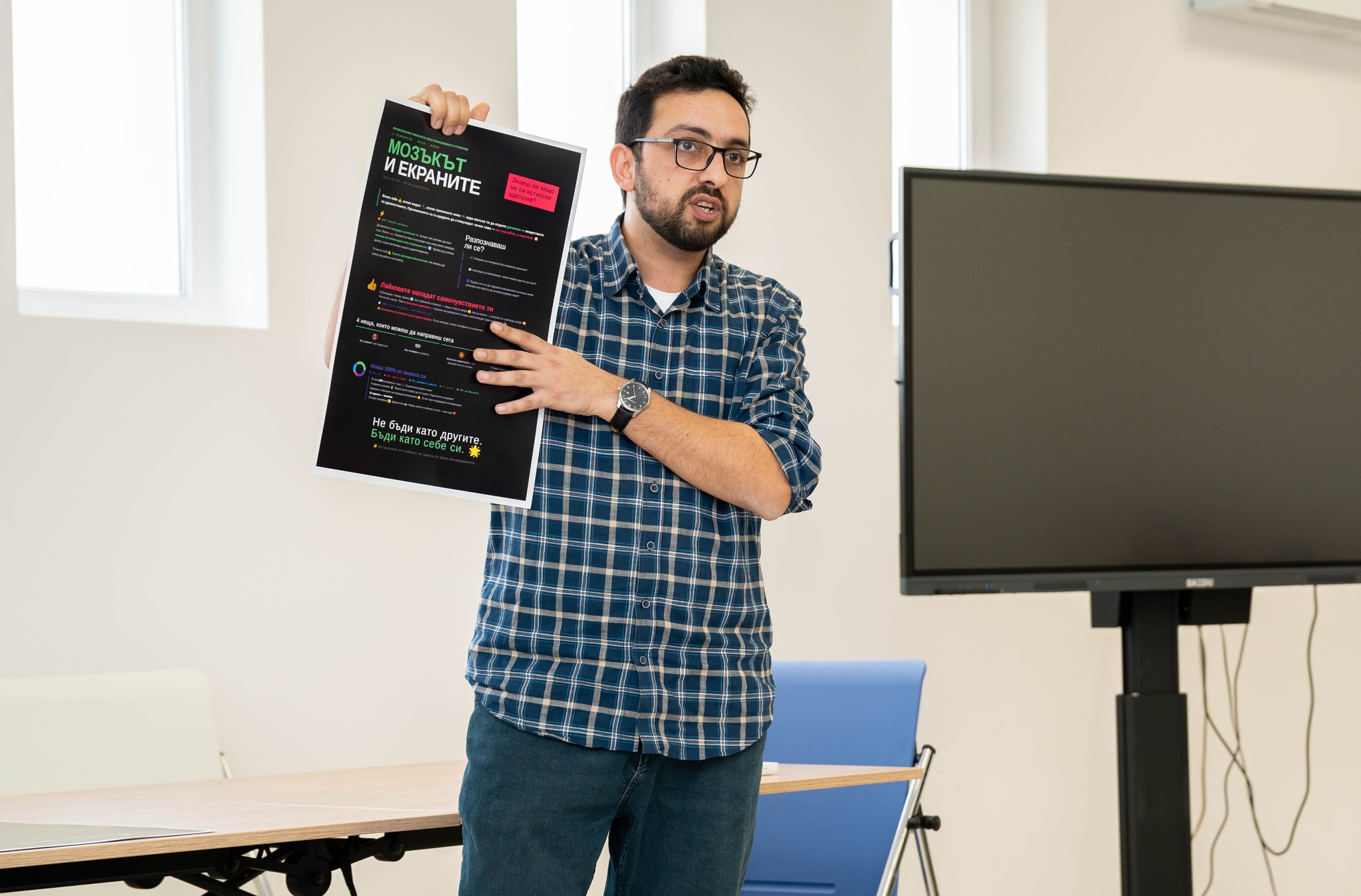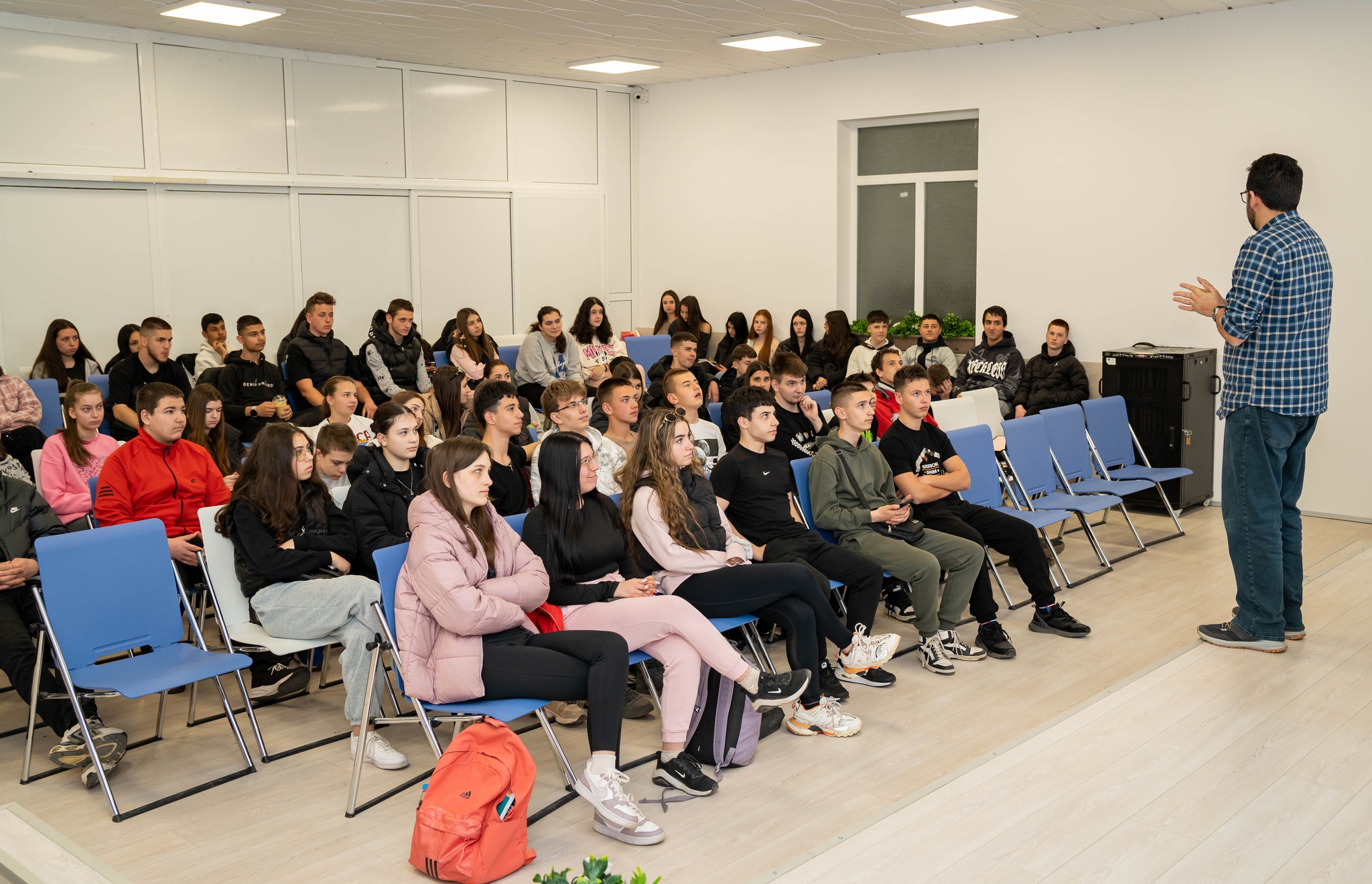 Пред деветокласниците в многофункционалната зала той постави акцент върху проблема с екранната зависимост при подрастващите.