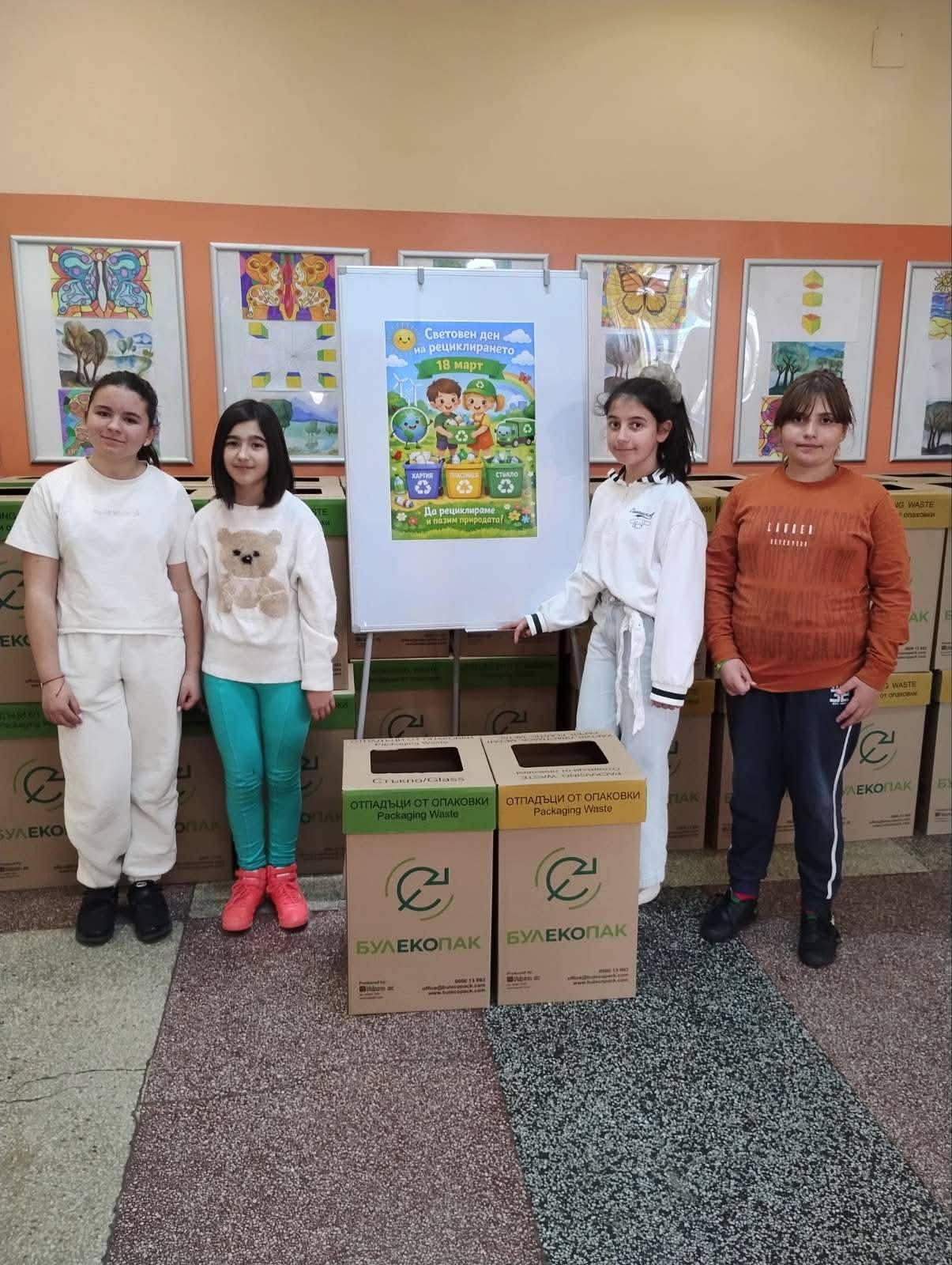 Благодарение на това сътрудничество, във всяка класна стая и специализиран кабинет учениците от клуб „Природни науки“ сглобиха и разположиха 30 комплекта картонени кутии (тип EcoBox) за хартия и пластмаса. Допълнително, в коридорите и административните площи на училището са инсталирани 20 специализирани контейнера, които ще улеснят ежедневното рециклиране на отпадъците от ученици и екип на училището.