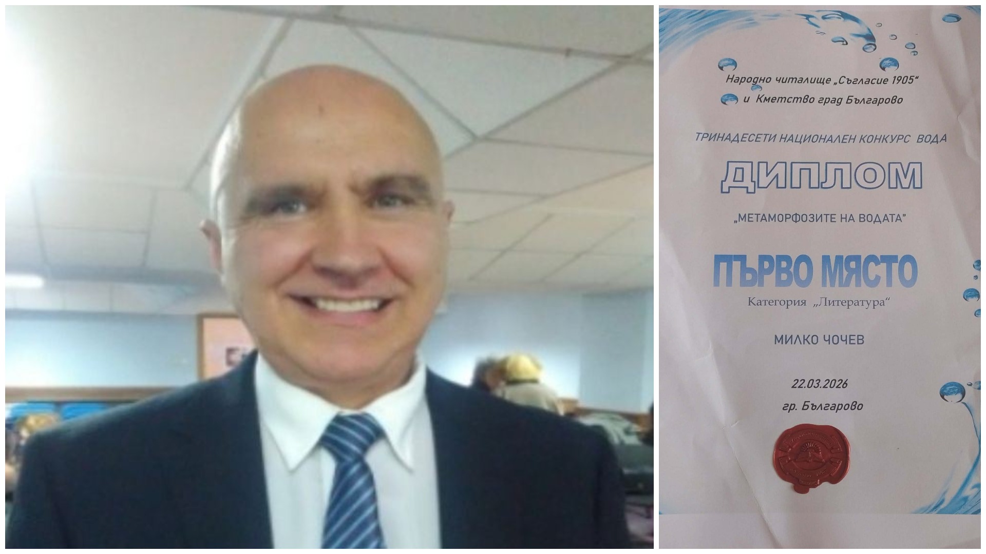Казанлъшкият поет Милко Чочев бе отличен с Първа награда за стихотворението „Светът без тебе би замлъкнал“ в Тринадесетото издание на Националния конкурс „ВОДА“. За тази изява той получи грамота, почетен плакет и материална награда.