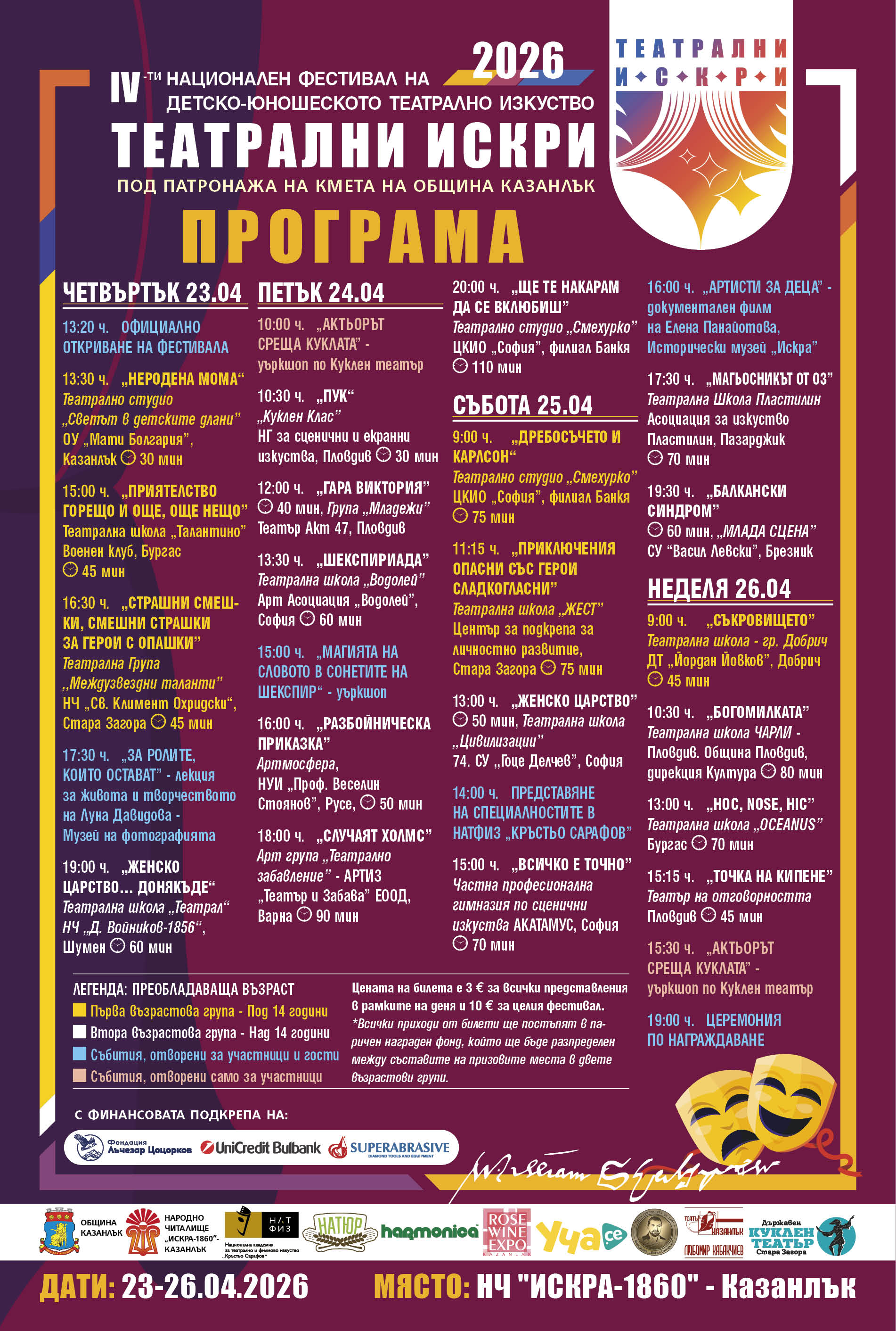 От 23 до 26 април 2026 г. Казанлък ще се превърне в сцена на детското и юношеското театрално изкуство, събирайки талантливи състави от цяла България.