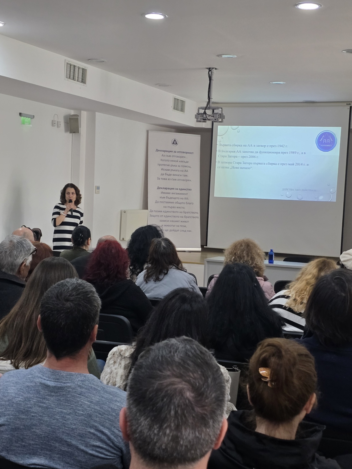 В основата на възстановяването в Анонимни Алкохолици стои взаимопомощта – хора, които споделят опит, сила и надежда, за да си помагат един на друг да останат трезви и да променят живота си. Гост на срещата беше д-р Иван Добринов, психиатър и началник на VI мъжко отделение в ДПБ „Д-р Г. Кисьов“ – Раднево, който сподели наблюденията си върху положителните промени при пациенти, включени в групи на АА, а в събитието участва и Златина Желева, психолог в Затвора – Стара Загора, която представи опита си в работата със зависими в изправителни институции и значението на сътрудничеството с АА.