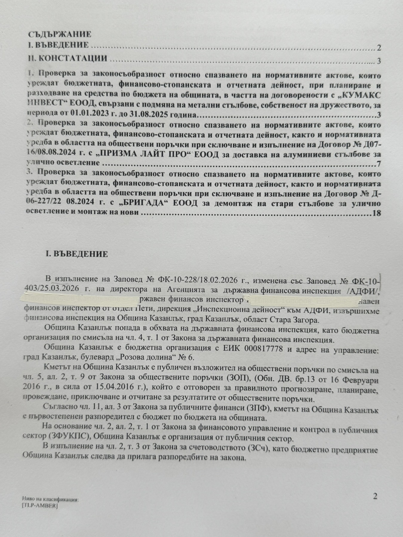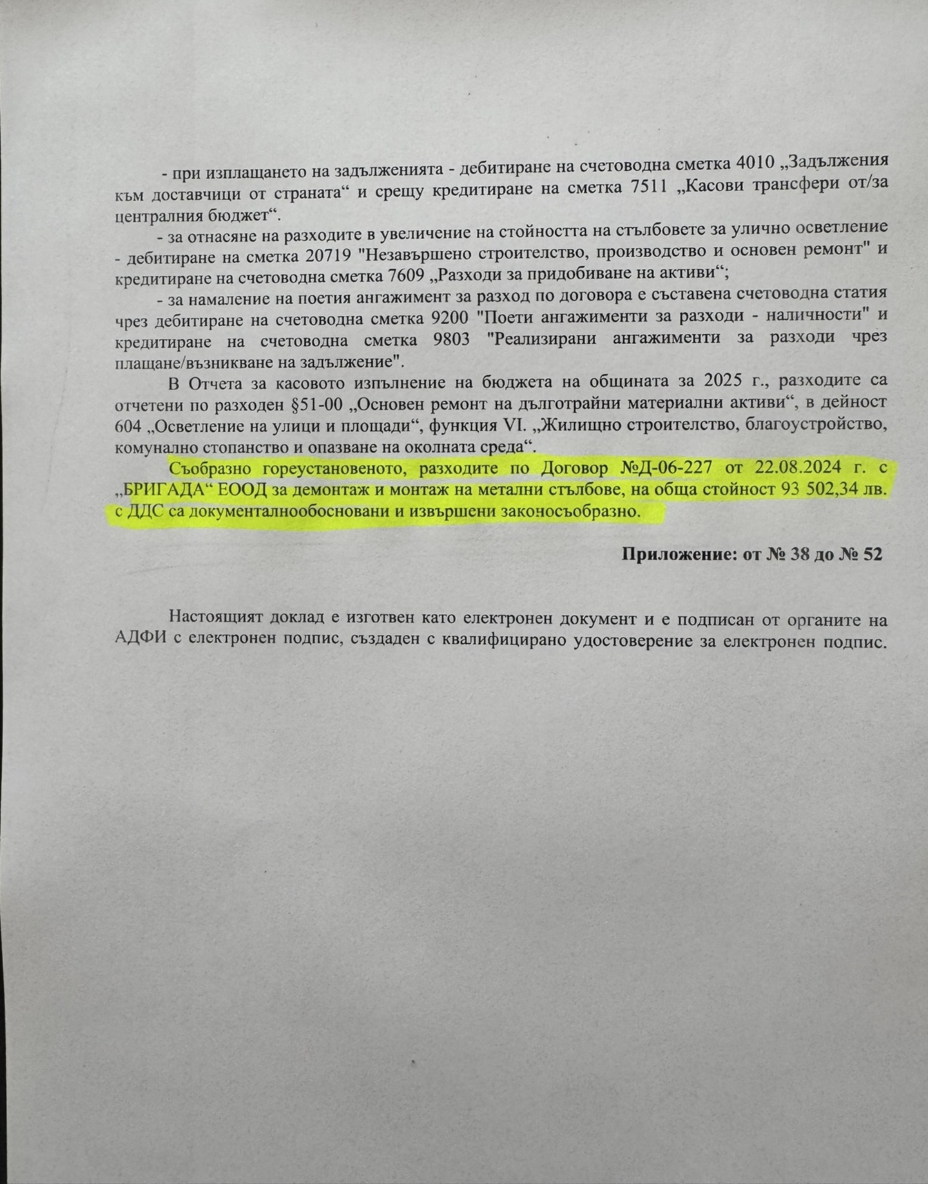 Заключението на доклада, по който са работили двама финансови инспектори от АДФИ – Пловдив и Стара Загора, установява пълна законосъобразност на целия процес по обследване на годността на старите стълбове, както и по закупуването и поставянето на новите.