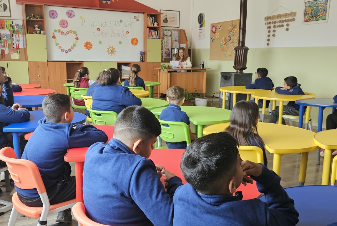 Ива Радева прочете на децата азиатската притча „Най-красивото цвете“ и като метафора на грижовността и търпението подари за всеки от малките си слушатели по пакетче семена за цветя с пожелание да ги посеят и отгледат в училищната си градина и в очакване да ѝ изпратят своите снимки след това.