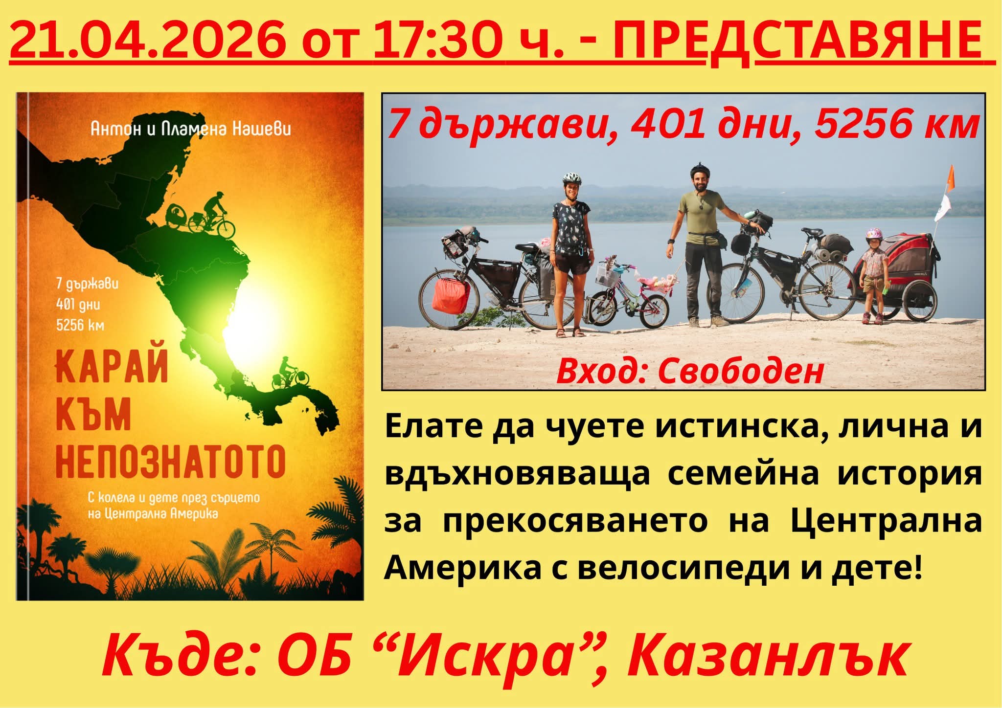 След представянето на първата им книга „Стъпки към непознатото” , семейство Нашеви отново са в Казанлък, за да ни разказажат за своето пътуване в Централна Америка. Историите са събрани в книгата „Карай към непознатото”.