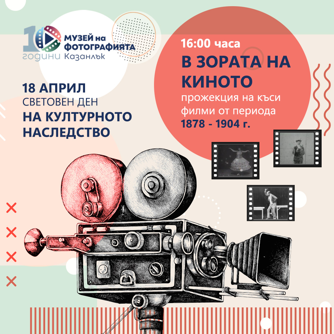 В деня на Световен ден на културното наследство, 18 април, от 16:00 часа, в Музеят на фотографията ще се проведе "В зората на киното" - прожекция на къси филми от периода 1878 - 1904 г.