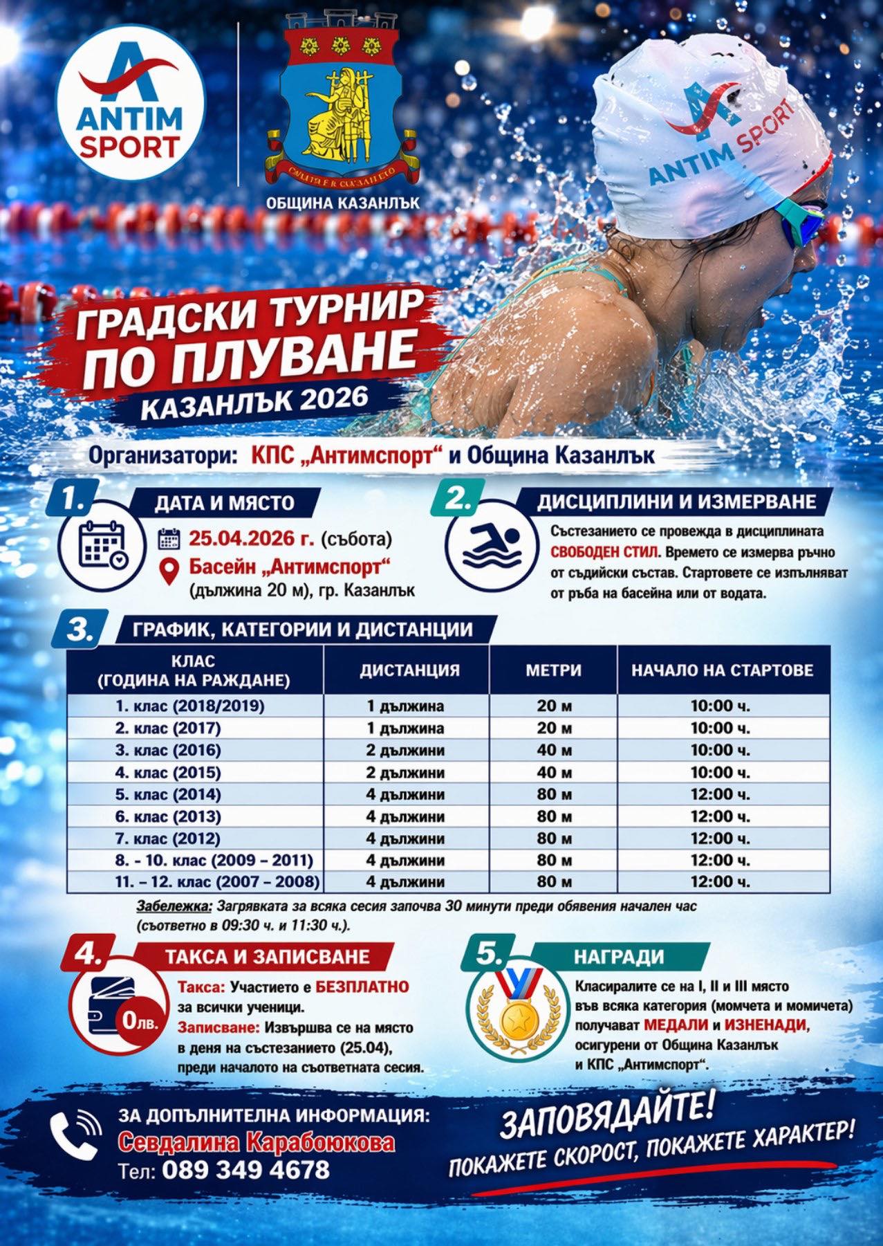 Събитието ще се състои на 25 април 2026 г. в басейн „Антимспорт“ и ще събере ученици от различни възрастови групи, които ще се състезават в дисциплината свободен стил.