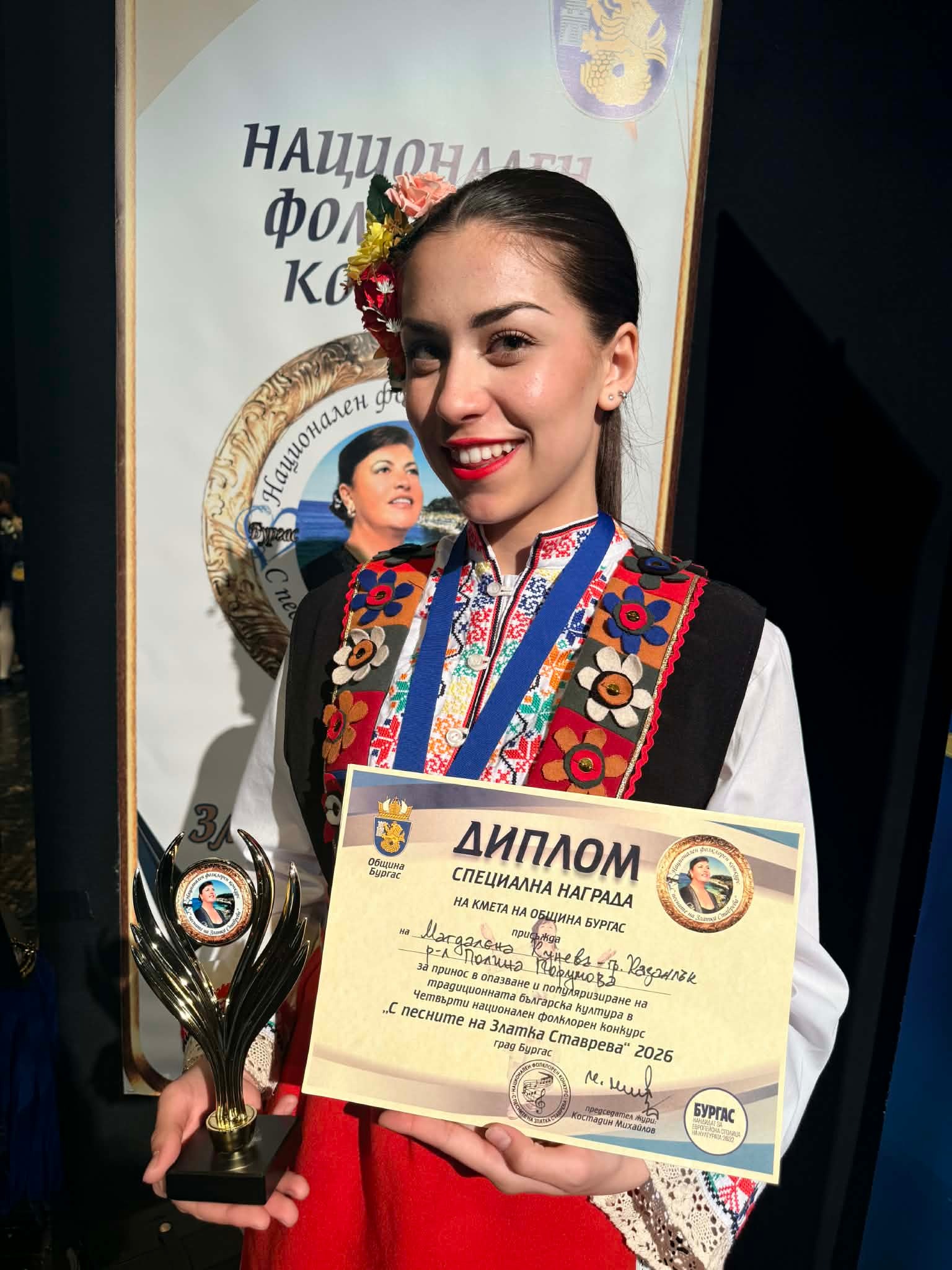 Специалната награда на кмета на Бургас за ученичка на вокалния педагог от Казанлък - Полина Порумова от Националния конкурс „С песните на Златка Ставрева“ в Бургас.
