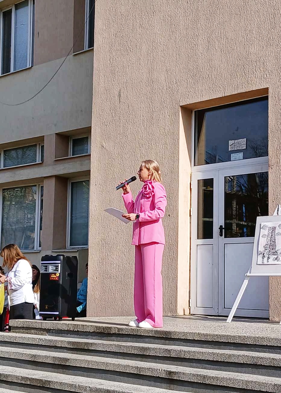 След това честването на 150-ата годишнина от Априлското въстание се пренесе в двора на училището. Началото бе поставено с химна на България, след което водещите (Никол Георгиева – 5 „а“ клас и Григор Калчев – 7 „б“ клас) припомниха ключови моменти от въстанието през 1876 година.