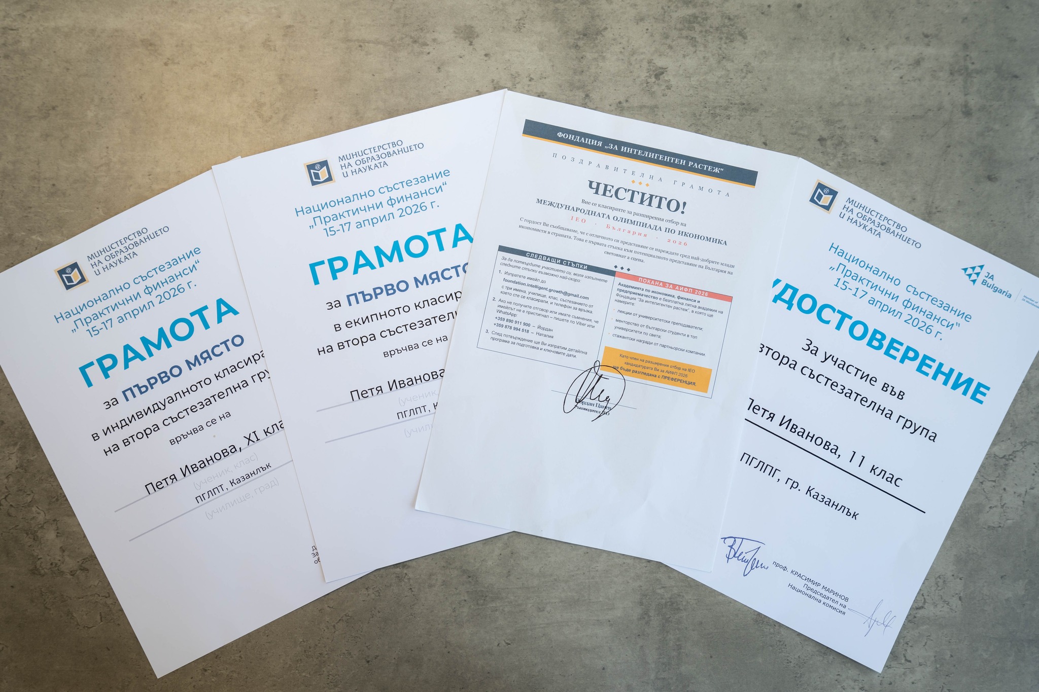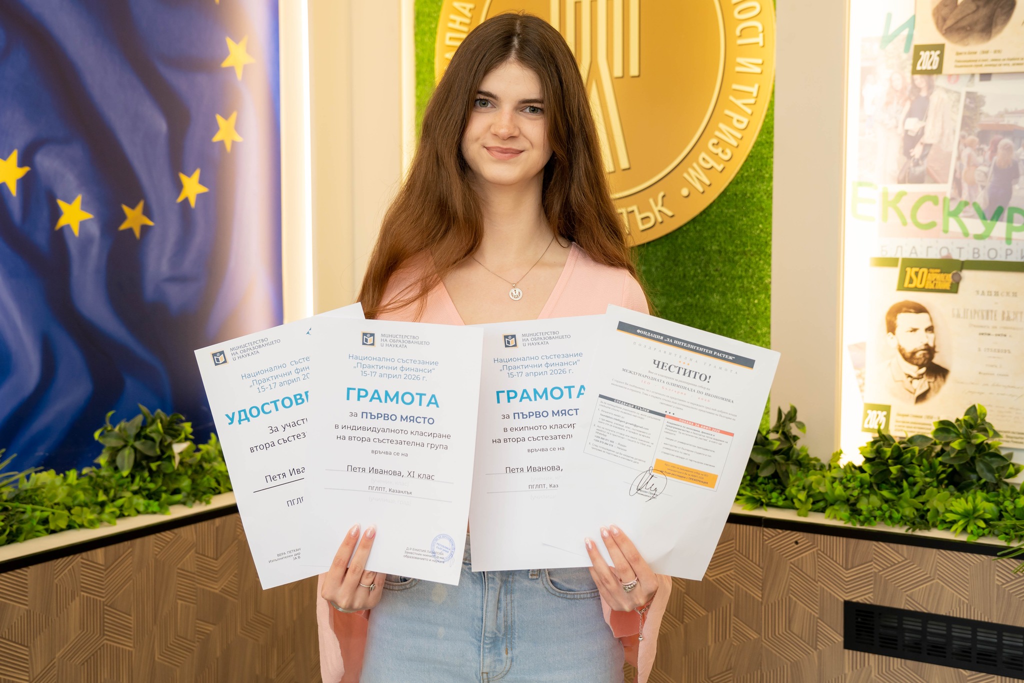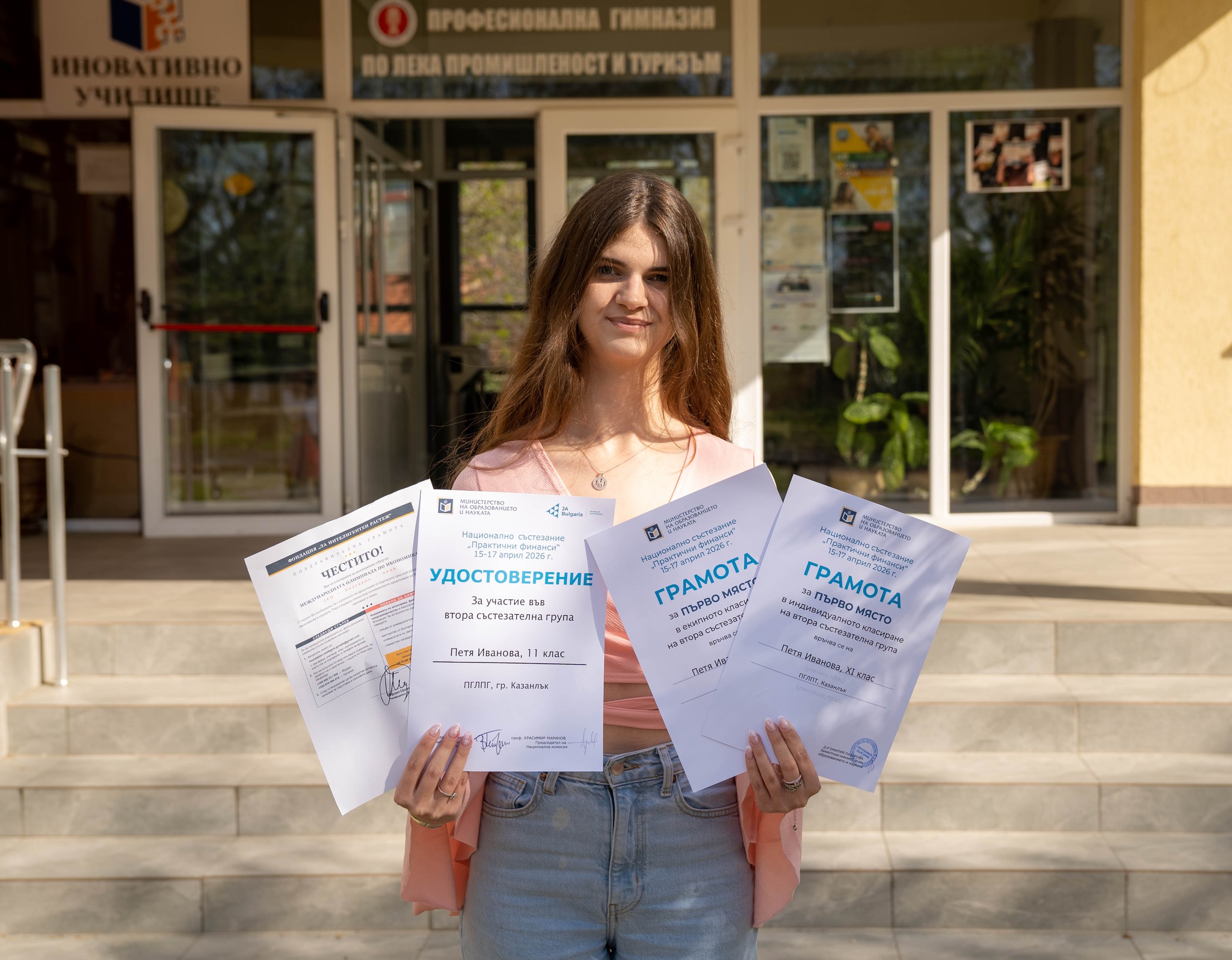 С изключително постижение се отличи ученичка от Професионалната гимназия по лека промишленост и туризъм – гр. Казанлък по време на финалния кръг на Националното състезание „Практични финанси“, проведен в периода 15–17 април 2026 г. в София. В престижната надпревара, организирана от Министерството на образованието и науката в партньорство с фондация „Джуниър Ачийвмънт България“, участие взеха над 2000 ученици от цялата страна.