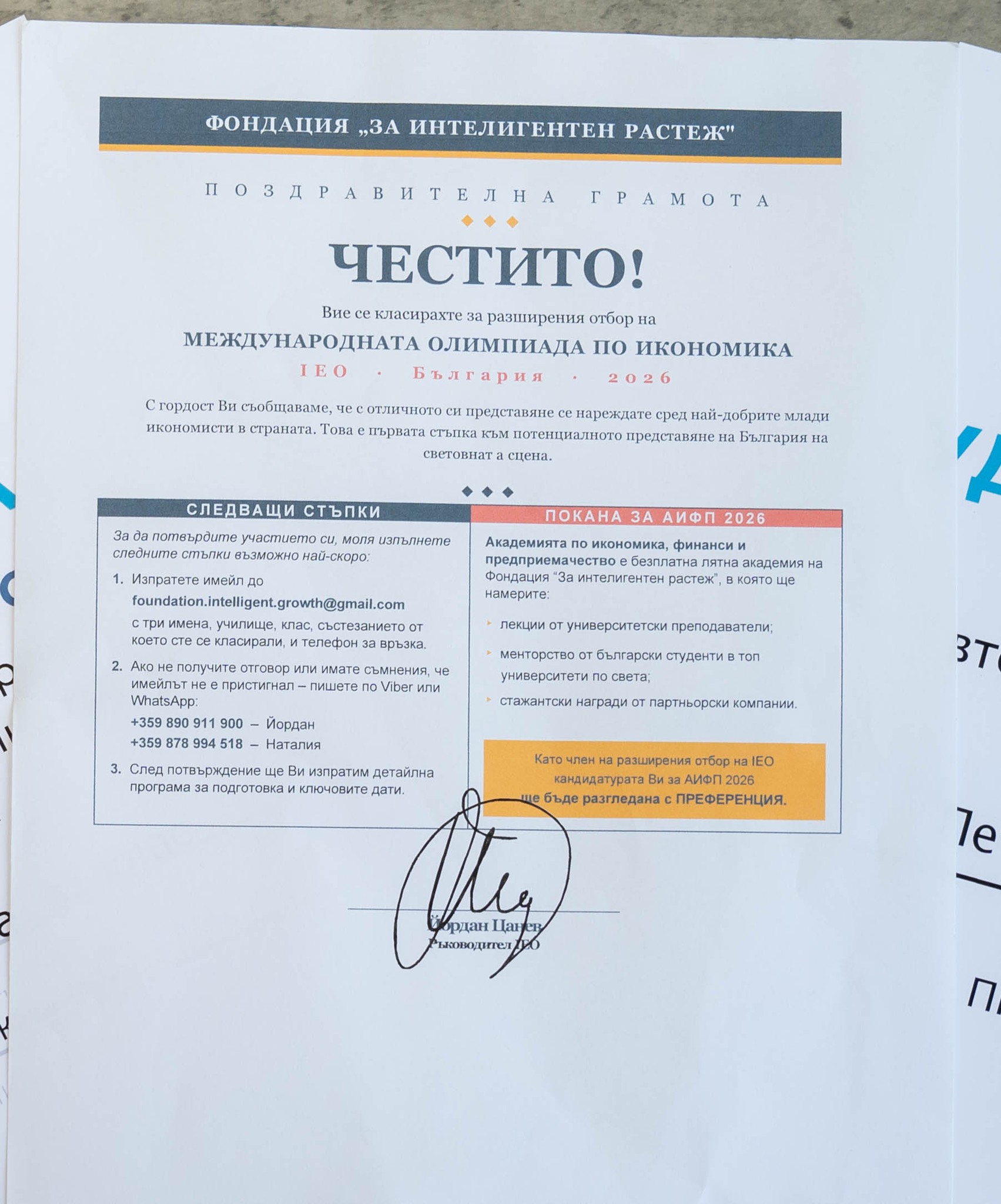 Успехът ѝ не спира дотук. Благодарение на високите си резултати, тя е включена в разширения национален отбор на България за участие в Международната олимпиада по икономика(IEO) – признание за нейния талант, постоянство и амбиция. През 2026 г. деветото издание на IEO ще се проведе от 12 до 20 юли в Суджоу Китай, а отборът на България ще участва присъствено.