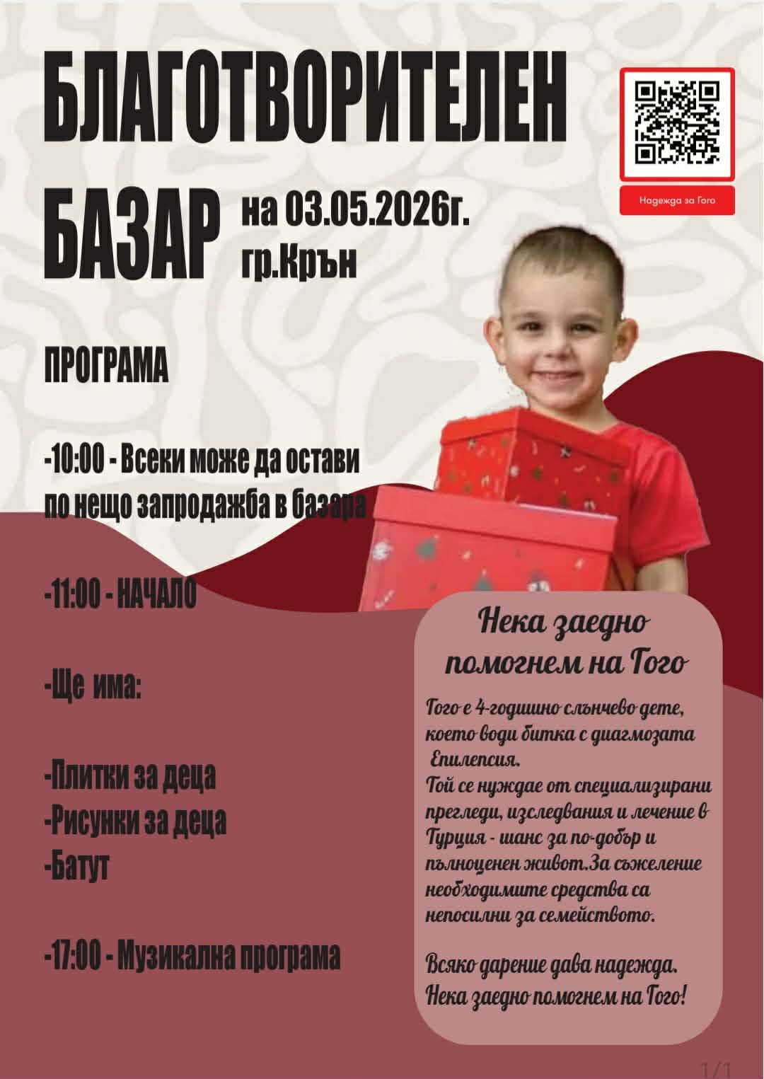Средства за 4-годишния Гого ще се събират и на благотворителния базар, който ще се проведе на 3-ти май в гр. Крън. Програмата на благородната инициатива ще започне от 11.00, като час по-рано всеки ще може да донесе нещо за продажба в базара. Инициаторите са подготвили забавления за децата. От 17.00ч, музикалната програма ще оглася градчето и ще помага на малкия боец.