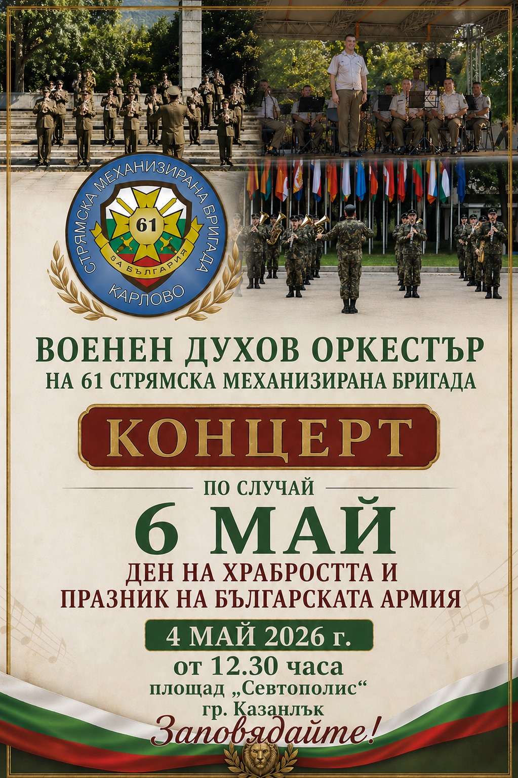 Военният духов оркестър на 61-ва Стрямска механизирана бригада, с диригент капитан Йордан Илиев ще изнесе тържествен концерт по повод 6 май - Ден на храбростта и празник на Българската армия.
