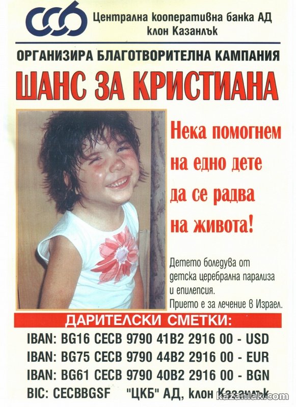 С полет на израелските авиолинии тази нощ за Тел Авив лети 6 годишната Кристиана Кънева от Казанлък. Момичето е болно от детска церебрална парализа, с лека умствена изостаналост и се нуждае от специализирано лечение в клиника в Израел. Заедно с Кристиана пътува и нейната майка Красимира Дамянова. Майката и детето ще бъдат посрещнати на летището от представители на българското посолство в Тел Авив, които ще се грижат за тях по време на целия им престой за лечение в клиниката.