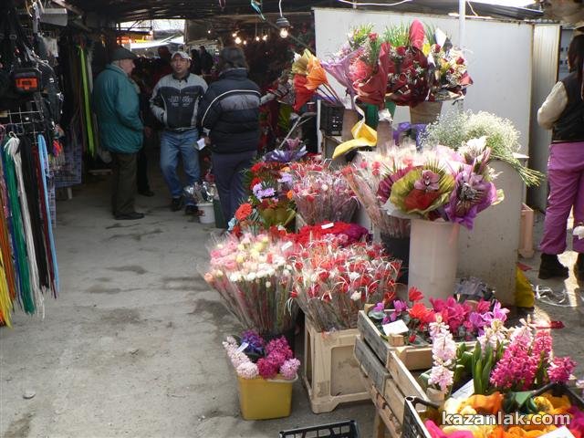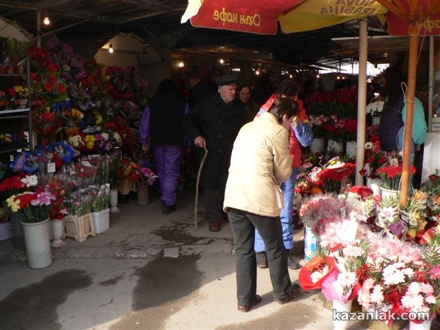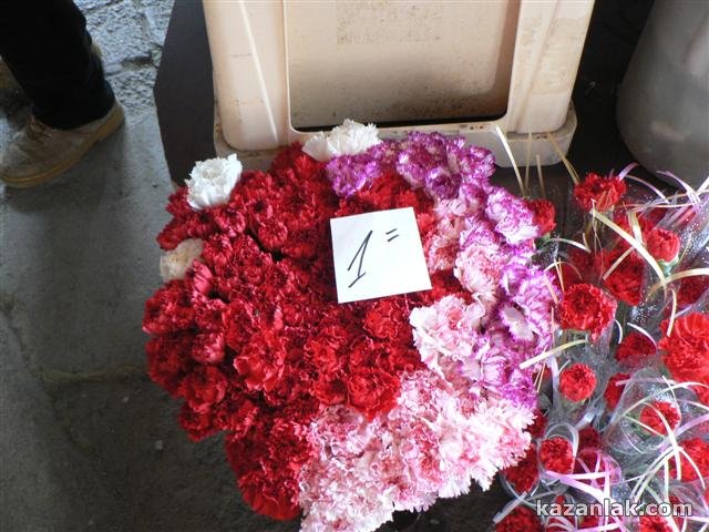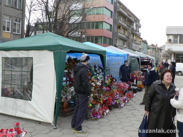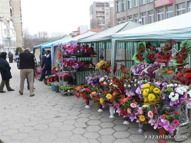 Множество търговци на цветя за празника 8 март може да се видят в Казанлък. На мястото на щандовете за мартеници на площад „Севтополис” в момента се продават цветя. На входа на кооперативния пазар също има няколко щанда, които търгуват с букети. Естествено най-посещавани са сергиите за цветя на пазара, които от край време си имат обособено място. Цените не са се променили въпреки празника споделиха търговците. Броя на продаващите растенията, които традиционно са най-търсените за Празника на жената е скочил поне 4 пъти. Най-евтини са карамфилите, които варират от левче до 1,50 лева. Една роза се продава на цена 5 лева, като красив букет с 3 от символите на града ни струва около 15 лева, а 5 рози в красива опаковка струват около 25 лева. „В Казанлък розите са значително по-евтини от другите градове, като в София една роза е около 8 лева.”-сподели един от продавачите. Ако времето се развали и търсенето намалее цените ще тръгнат надолу през утрешния ден сподели друг човек продаващ цветя.