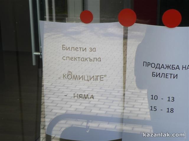 В момента на касите на "Искра 4" се продават талони за всички постановки от "Чудомирови празници 2012", като на вратата стои надпис "Билети за спектакъла Комиците няма".