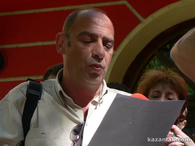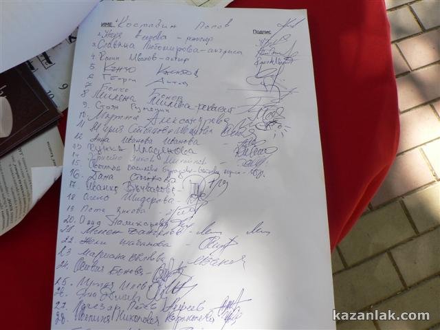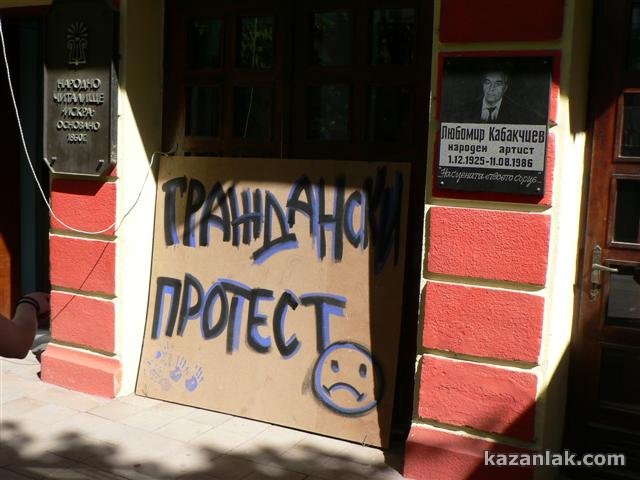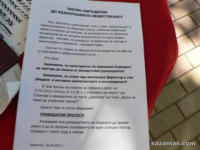 Служителите на казанлъшкия театър „Любомир Кабакчиев” излязоха на протест пред сградата на НЧ”Искра”. В 16 часа актьорите издигнаха надпис „Граждански протест”, след което прочетоха пред медиите в града писмо-обръщение към обществеността подписано от всички работещи в театъра. Причината за протестите е проведеният вчера конкурс за Директор на институцията, до момента резултатите от него не са обявени, но според театралите победителя е предрешен. Писмо към обществеността на Казанлък и България бе прочетено от Константин Попов, който е Председател на КТ”Подкрепа” в театъра, но изрично подчерта, че протеста не е синдикален. В писмото подписано от целия колектив на театъра се казва: