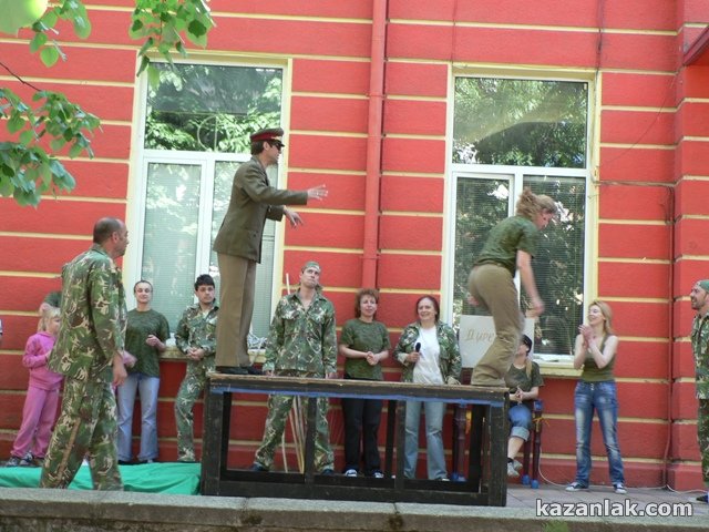 В днешния 1 май гражданският протест на работещите в Театър”Любомир Кабакчиев” продължи с интересен уъркшоп. Артистите излязоха пред НЧ”Искра” облечени с военни униформи и се забавляваха с различни игри, в които се включиха и минаващите по улица Искра. Мнозина се спираха и забавляваха с различните игри: прескачане на въже, салта, фехтовка и други игри. Така дори и в празничните дни театралите продължиха да работят и протестират против новоизбрания директор на Театъра. В подписката, която организираха под наслов” ДА СПАСИМ ТЕАТЪР ЛЮБОМИР КАБАКЧИЕВ Казанлък” до 14 часа се бяха подписали 1405 души. Още 326 са хората, които подкрепиха каузата в интернет. Днес следобед празничната програма на артистите продължава пред Читалището.