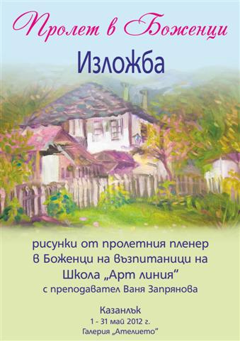 25 рисунки на 10 възпитаника на казанлъшката школа „Арт линия” бе представена в галерия Боженци през месец април. Младите казанлъшки художници са на възраст от 10 до 16 години, като до края на май изложбата ще г може да бъде разгледана в галерия „Ателието”- Казанлък.