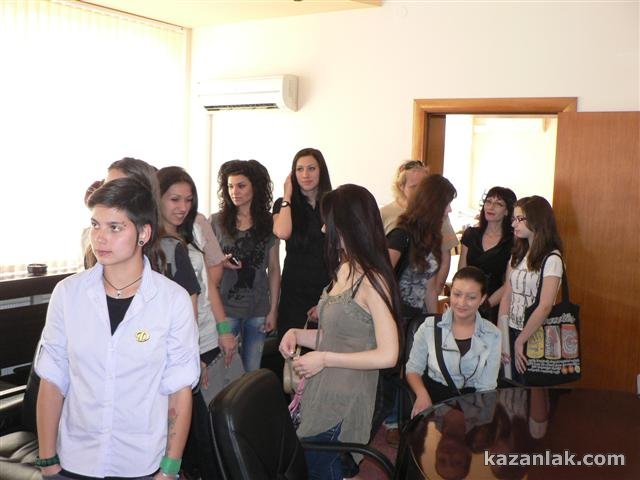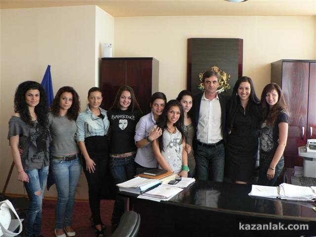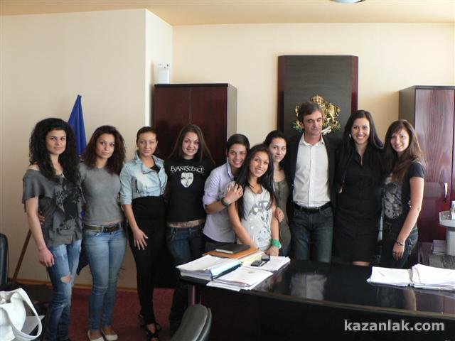 След срещата си с градоначалника абитуриентките посетиха и кабинета на Председателя на Общинския съвет- Николай Златанов. Той също обясни дейността на ОбС, като образно обясни, че Общински съвет и Общинска администрация са като две зъбни колела, които се въртят в синхрон. Интересно бе, че красавиците изразиха позициите си относно случващото се в Театър”Любомир Кабакчиев”. 10-те избранички застанаха на различни позиции относно избора на нов директор на Театъра.