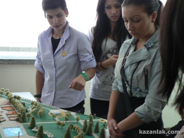 Момичетата разгледаха и залата за пресконференции, където се снимаха до панорамна снимка на града на розите и разгледаха макета на проекта за нов облик на парк „Розариум”. През кратката обиколка в сградата момичетата бяха придружавани от секретаря на Община Казанлък Ваня Иванова. Утре красавиците ще бъдат на обиколка по културни и исторически забележителности в Община Казанлък, като маршрута е изработен от директора на Исторически музей „Искра” – Момчил Маринов.