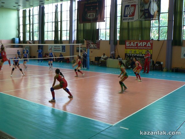 Първа победа на провеждащите се в града на розите финали на Републиканското първенство за девойки старша възраст записа днес отборът на „Казанлък волей“. Казанлъчанки днес не оставиха никакъв шанс на съперничките си от „Велбъжд“/Кюстендил/ и ги победиха с 3:0. Момичетата ни водени от Лариса Китипова показаха силните си страни и разбиха противничките си в отделните части с : 25:3, 25:5 и 25:8. В срещата домакините излязоха в състав:Кристина Дерменджиева, Белиса Бюрханова, Елица Баракова, Станимира Тенева, Екатерина Топалов, Диана Казакова. От участие за състава от Казанлък се отказа Калина Манева. Утре от 17 часа „Казанлък“ излиза в последната си среща от предварителната група срещу „Бдин Вида“/Видин/. Срещите от предварителната група завършват в четвъртък, след което в петък са полуфиналите, а в събота е финалния мач.