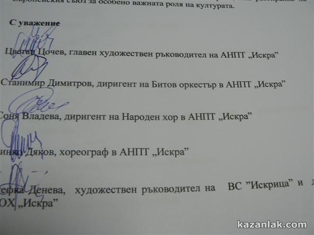 Художествените ръководители и преподаватели в НЧ ”Искра” подписаха декларация, която ще бъде изпратена до: Вежди Рашидов - Министър на културата, Даниела Петрова - Председател на ПК по култура в 41-о НС, Недялко Недялков - Областен управител на област Стара Загора, Николай Златанов - Председател на Общински съвет – Казанлък, Галина Стоянова - Кмет на Община Казанлък и до всички общински съветници. Декларацията е във връзка с намалената субсидия за Читалището. Ето и текста на декларацията: