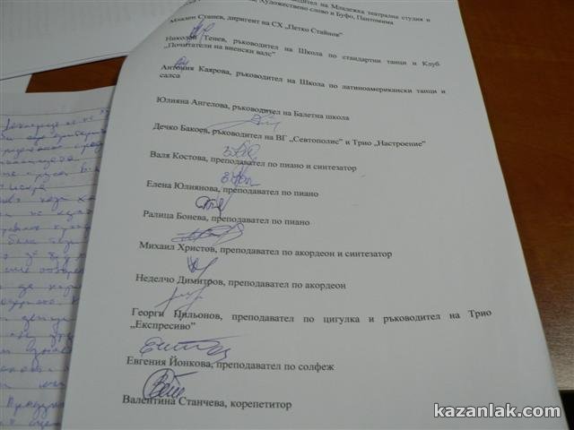 Долуподписаните ръководители и преподаватели, заявяваме, че очакваме да преразгледате ситуацията, в която поставяте най-старата институция в региона. Уверяваме ви, че сме длъжни, заради завещанието „Изворът на щастието се състои в съгласието” да предприемем всички необходими действия, за да защитим казанлъшката съкровищница.