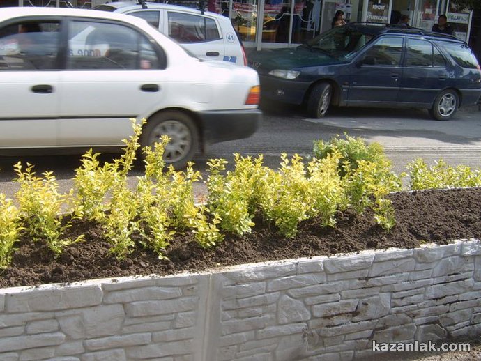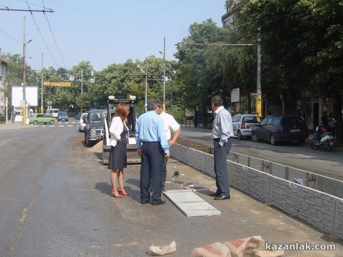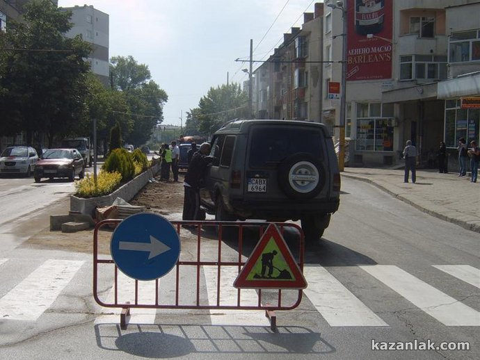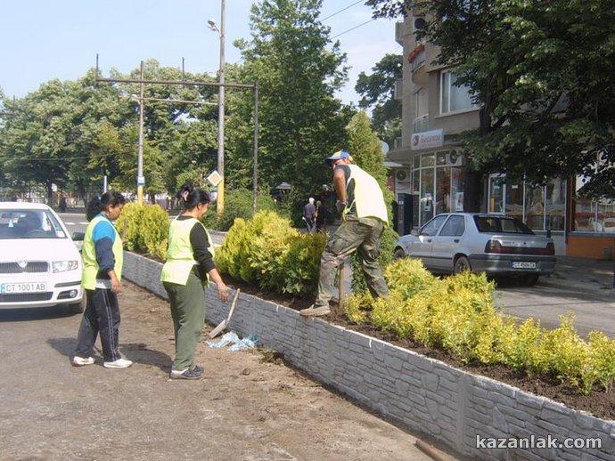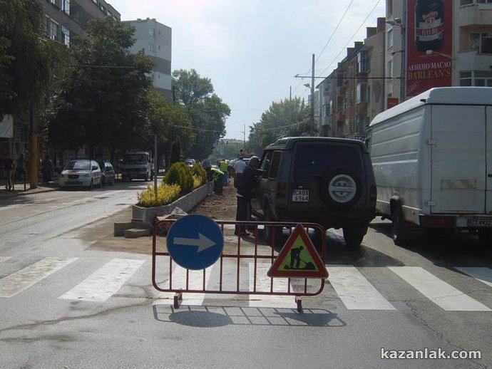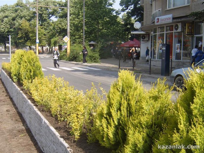От днес започна реконструкция и озеленяване между двете платна в участъка на бул. "Ал. Батенберг" от гимназия "Кирил и Методий" до светофарите на реката. Новата придобивка в Казанлък инспектираха лично тази сутрин Кметът Галина Стоянова, зам. кметът Петър Косев и главният архитект на общината Ивелин Недялков. Зелените храсти се садят между специално изградени бордюри, имитиращи каменна стена. "Засега, до Празника на Розата, ще успеем да направим само този участък", разказа пред Kazanlak.Com Галина Стоянова. Предстои да се ремонтира и тротоара от северната страна на тази отсечка, като ще бъдат сменени металните стопери (стълбовете, пречещи на автомобили да се качват за паркиране на тротоара) с модерни, като софийските, обясни кметът. На красивите бордюри, опасващи зеленината ще бъдат сложени специални светлоотразители, допълни главният архитект Недялков. Храстите, които се садят в момента са туи и лагуструми, като в завършения си вид в зеленината ще се вплетат и влачещи се рози, които ще допълнят зеления ансамбъл в унисон с фестивала на Казанлък - разказа специалистът по чистотата в Общината Николай Чалъков.