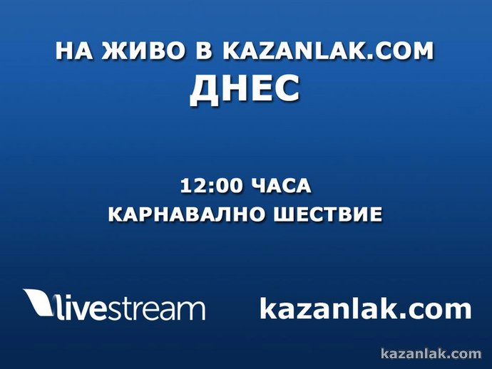 Днес от 12 часа Kazanlak.Com отново ще излъчва на живо от Казанлък. Карнавалното шествие в центъра на града ще се предава с HD качество тук: