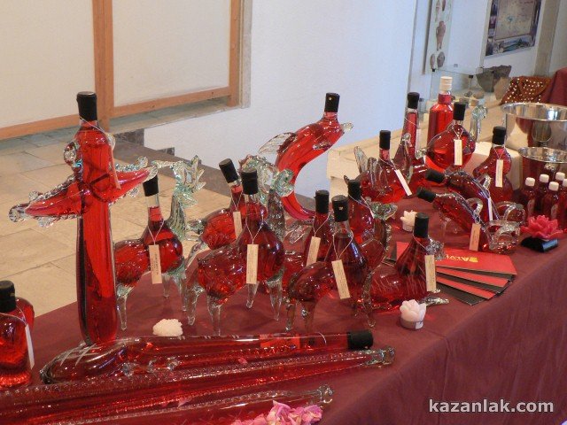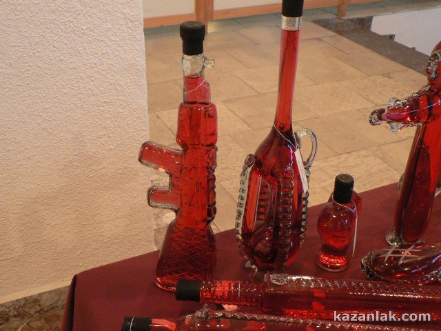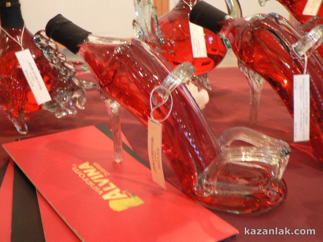 Виното на добричката фирма е в съдове с форми на : Мечове, дамски обувки, кръстове, бикове, делфини лебеди и характерните за Казанлък рози и огнестрелни оръжия и още ред причудливи форми. Изложението е отворено за посетители, като всеки може да дегустира вино и да закупи избраната от него бутилка. Утре от 12,30 ще бъдат наградени най-добрите вина от реколта 2010-2011 година от участващите във Фестивала. Официалното откриване на събитието е днес от 16,30 часа.